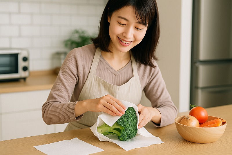例えば、野菜を新聞紙で包んで冷蔵庫に入れる作業を一緒に行えば、子どもが食材の扱いを学ぶ良いきっかけになります。ペットが近くにいる場合でも、乾燥剤を使わない方法なら誤飲の心配がなく安心です。