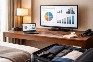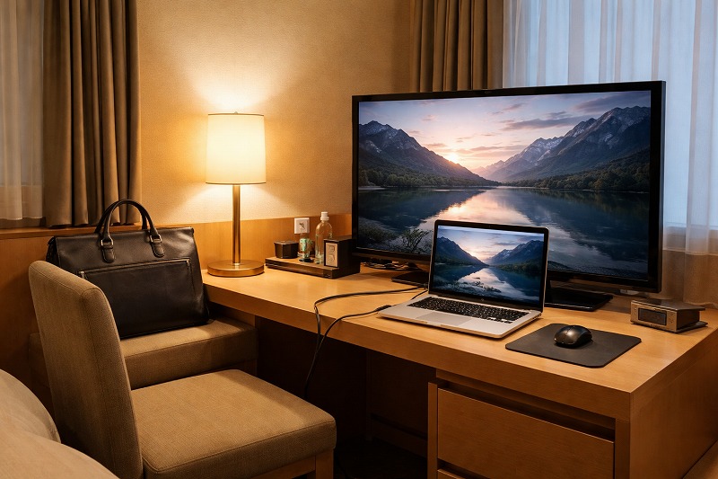 出張先のホテルで、 「パソコンやスマホの画面をテレビに映したい」 と思ったことはありませんか?プレゼン資料を確認したり、動画を大きな画面で見直したり、作業効率を上げるためにもとても便利ですよね。