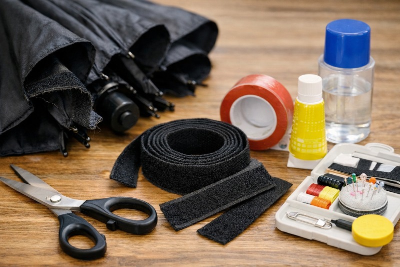 縫える環境があるなら、強度はかなり上がります。特に毎日の通勤・通学で使う傘の場合は、縫い補強をしておくと安心です。布用ボンドは、縫う前の仮固定や端のほつれ止めに役立ちます。防水スプレーは必須ではありませんが、仕上げに軽く使うことで雨の日の剥がれ防止につながります。
