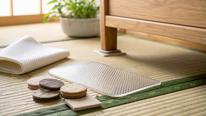 クッション材を挟むことで凹みを軽減できます。フェルトやマットなどの保護材を使うことで、家具の重さを分散し、畳へのダメージを防ぐことができます。特に長期間設置する家具は、必ず対策しておくと安心です。