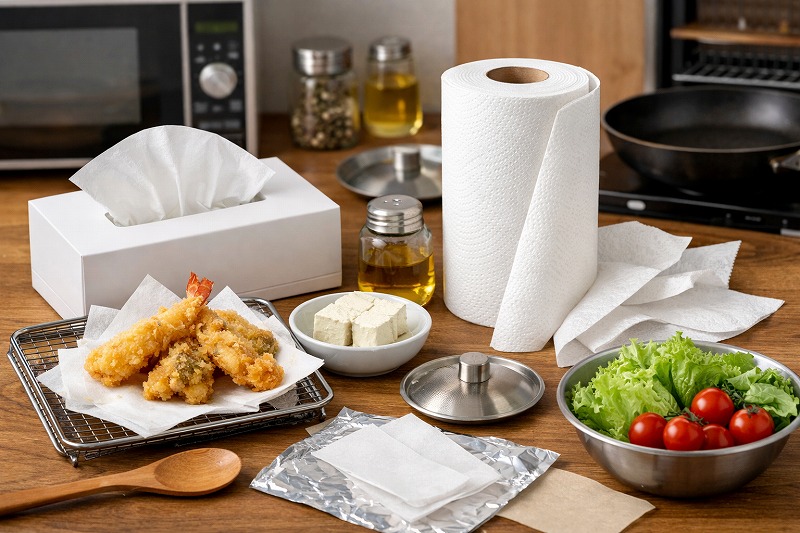 食品に直接触れる用途では、食品用として設計された製品かどうか確認し、とくに油分が多い料理や温かい食材に使う場合は、専用のキッチンペーパーを選ぶほうが安心感があります。