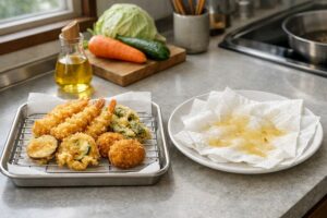この方法なら、揚げ物が直接ティッシュに触れないため破れにくく、余分な油だけを効率よく落とすことができます。また、揚げたての高温状態ではなく、少し落ち着いてから置くとより安心です。