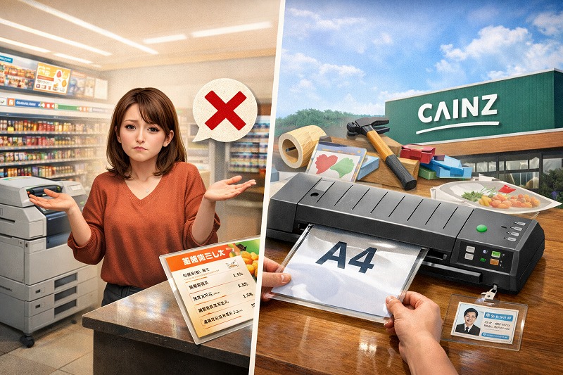 | カインズ | 約100〜200円(セルフ) | 安価で自分で加工可能 | 一部店舗には業務用機もあり、ラミネートフィルムも種類豊富に取り揃えられている |